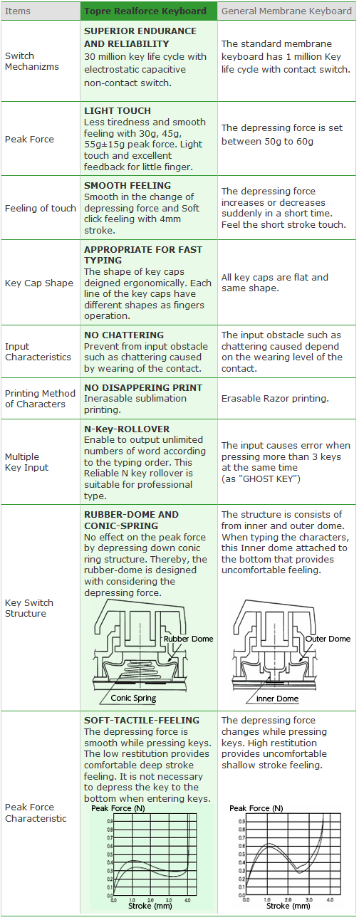 The patented 30 million key life cycle non-contact electrostatic capacitance switches are also highly durable, and Topre keyboards have gained favor as specialized input devices in distribution, transportation, medical, and broadcasting environments.